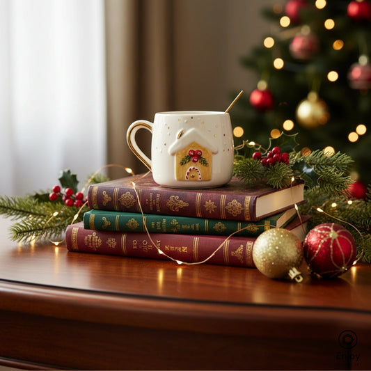 كوب عيد الميلاد المصنوع يدويًا على شكل بيت خبز الزنجبيل - 10 أونصة بمقبض ذهبي