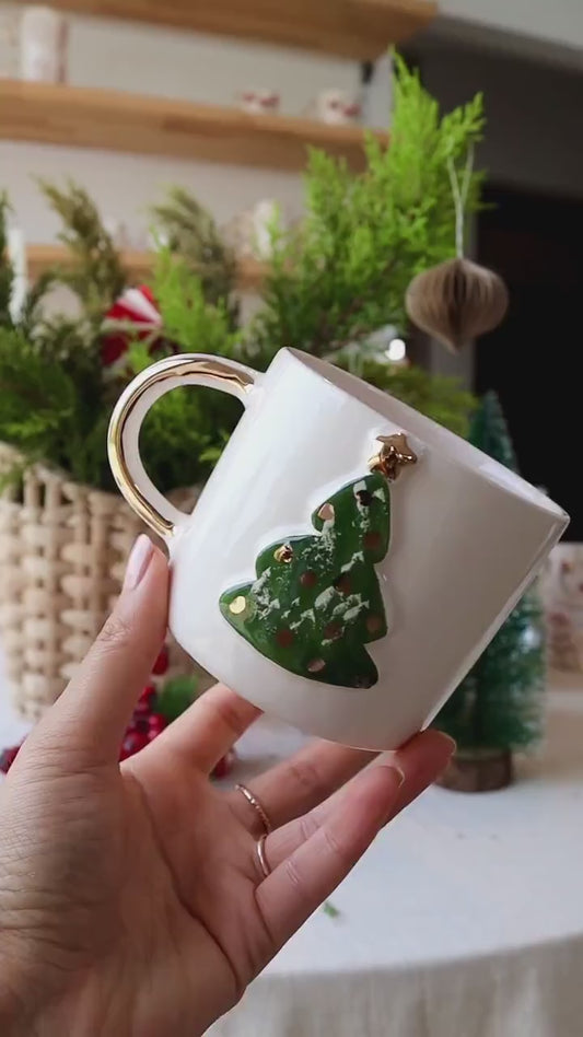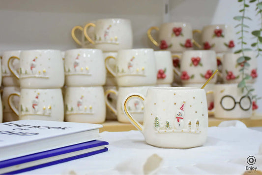 Handmade Snowman & Christmas Tree Ceramic Mug - Gold Handle