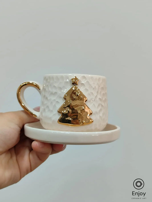 Gold Christmas Tree Espresso Cup with Saucer – Festive 5.4 oz Handmade Ceramic
