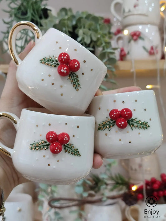 Handmade Holly Berry Espresso Cup with Gold Handle and Saucer – 5.4 oz