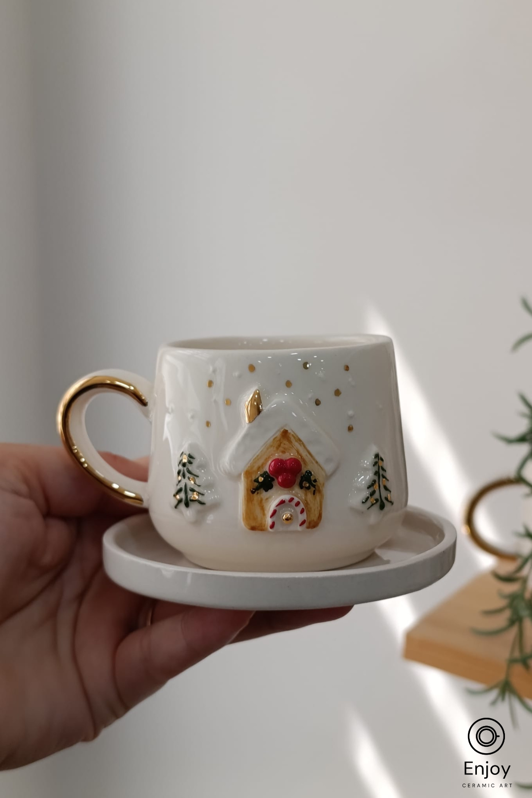 Add a touch of Christmas magic to your coffee ritual with this handmade ceramic espresso cup and saucer. Featuring a charming 3D gingerbread house, snowy details, and a glossy gold handle, each piece is crafted with love and care. Perfect for espresso, macchiato, or festive gifting.